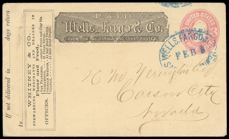 Whitney & Co. Forwarding Merchants [etc.], printed advertising vertically at left of cover (Thomas WHT-401) on common Wells, Fargo printed frank with their blue oval "Sac Messenger" datestamp to Carson City, Nevada on 1864-65 issue 3c pink on buff entire (U59), original enclosure on Whitney's stationery datelined "San Francisco, Feb 5, 1886", so used well after their days of operating an express, Very Fine.