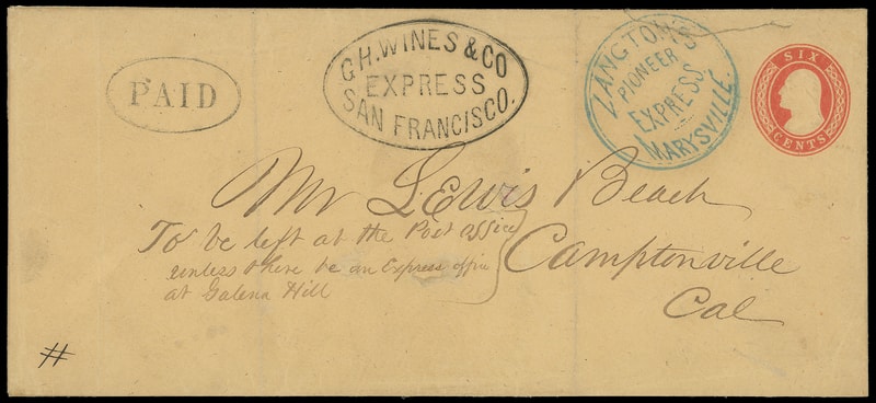 G.H. Wines & Co. Express San Francisco., bold strike of black company oval and matching " Paid in oval handstamp on double-rate 6¢ red (U12) buff Nesbitt legal-size entire to Camptonville Cal., conjunctive blue " Langton's Pioneer Express Marysville. " circular company handstamp (Thomas LAN-105) and manuscript sender's directive "To be left at the Post Office unless there be an Express office at Galena Hill"; two pressed out vertical file folks, a couple small erosion spots repaired in address area, sealed tear at upper right into Langton's handstamp, Fine, cover not listed in the Thomas census. .
