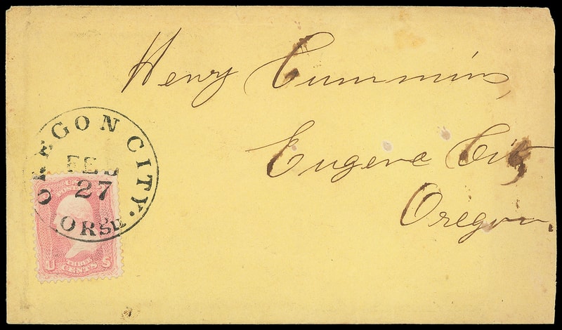 Oregon City, Orgn. Feb 27, clear strike of cds ties 3¢ rose pink (64b) on circa 1862 yellow cover to Eugene City, Oregon; reduced at right, F.-V.F. and scarce rose pink use from Oregon.