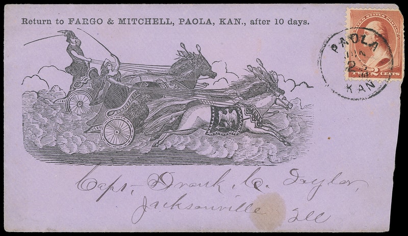 Paola, Kan., Jun 23, cds ties 2¢ red brown (210) on lavender "Fargo & Mitchell" advertising cover showing Roman horse-drawn War Chariots scene, addressed to Jacksonville Ill.; reduced at right affecting 2¢, tone spot, Fine and unusual ad cover.