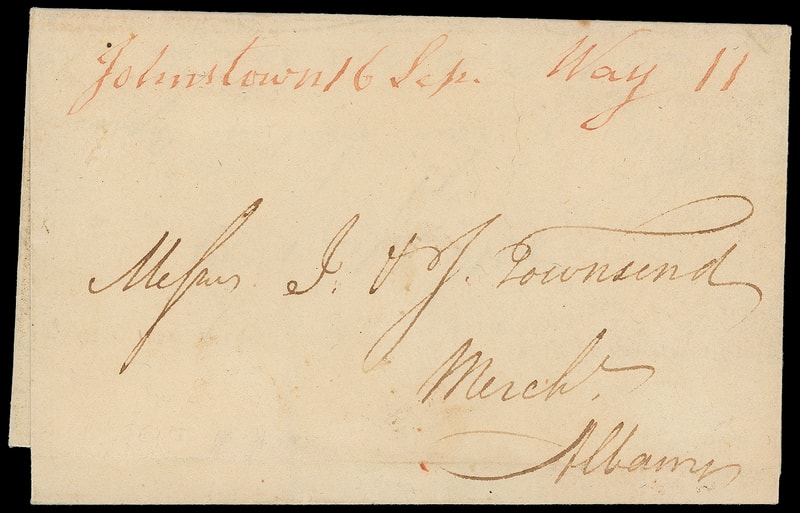 (New York) "Johnstown 16 Sep.", red manuscript postmark and matching " Way 11 " rating on 1814 folded letter to Albany N.Y., Very Fine, ex-Hahn .