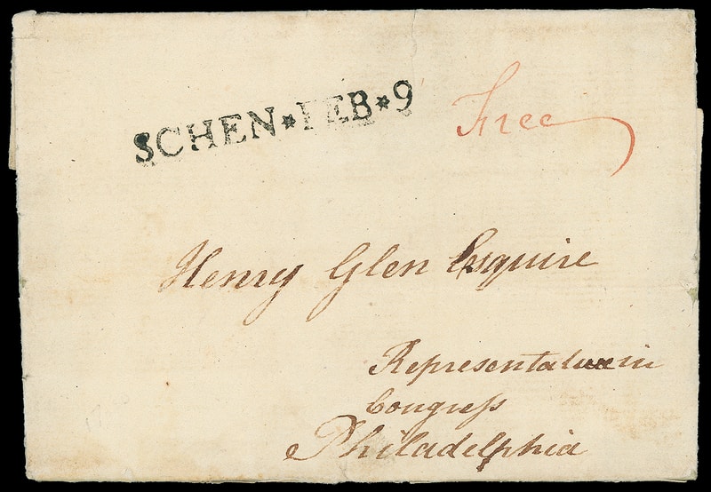 1797 (Feb. 9) "SCHEN * FEB * 9", bold straightline postmark and red manuscript "Free" rating on Feb. 6th folded letter to Henry Glen, House of Representatives, Congress, Philadelphia Pa., letter from John Saunders encloses a power of attorney to collect principal and interest on loans to the U.S. government…; small edge tear and some separations, otherwise Very Fine, ex-Hahn .