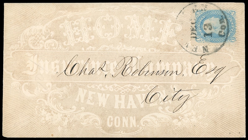 (Insurance) Home Insurance Company, New Haven Ct., all-over advertising design in light gray on cover bearing 1¢ blue (63) tied by partial "New Haven Con. Dec 13" cds to local city address; part of flap missing, Very Fine.
