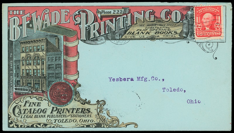 (Printing & Publishing) Toledo OH, The B.F. Wade Printing Co., full color illustrated ad on blue cover bearing (Printing & Publishing) Toledo OH, The B.F. Wade Printing Co. tied by "Toledo Oh., Feb 11, 1905" machine cancel to local address, additional illustrated ad on reverse, opened at top, Very Fine, a gem example of this beautiful ad cover. .