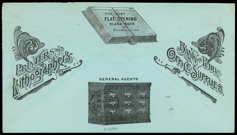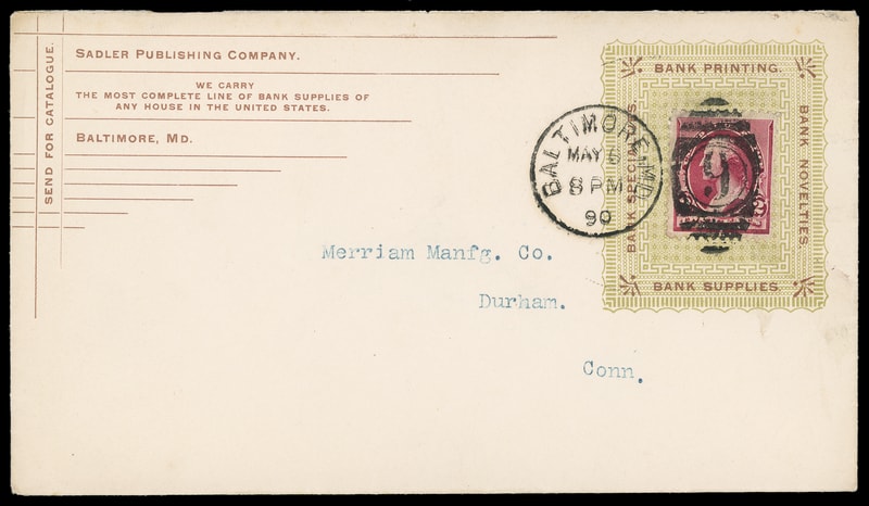 (Banking) "Bank Printing…Bank Supplies", Sadler Publishing Co., Baltimore Md., ornate bi-colored stamp collar on cover bearing 2c lake (219D) tied by "Baltimore, Md. May 6, 1890" duplex to Durham, Conn., Extremely Fine.