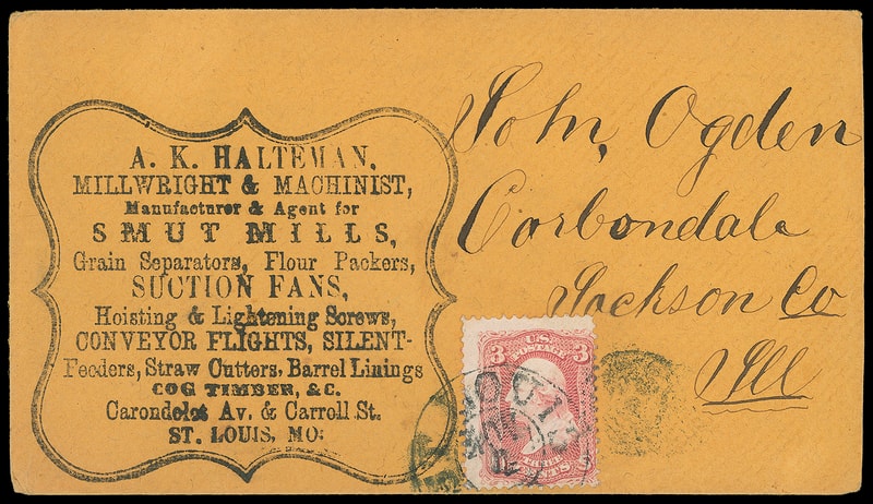 (Manufacturing) A.K. Halteman, Millwright & Machinist, large shield advertising corner card on orange cover bearing 3¢ rose (65) tied by "St. Louis, Mo. Nov 2" duplex to Carbondale Ill.; reduced slightly at right, Very Fine, ex-Nettles .