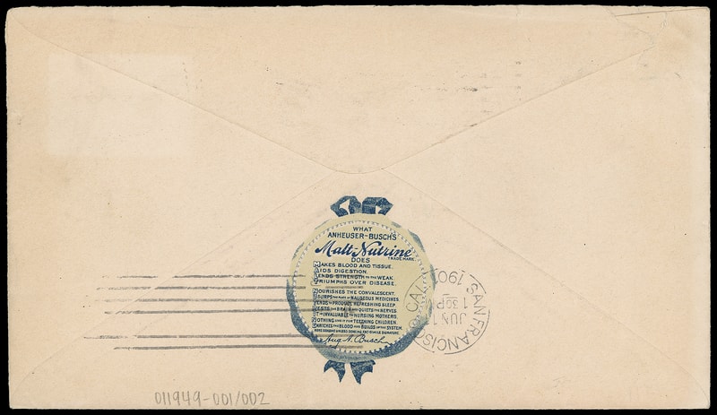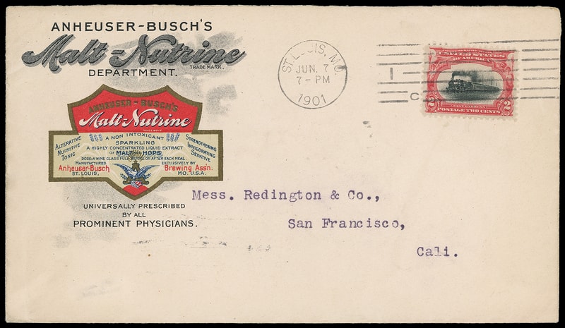 (Alcohol) Anheuser Busch's Malt-Nutrine, St. Louis Mo., multicolor gold leaf ad on cover bearing 2¢ Pan-American (295) tied by "St. Louis, Mo. Jun 7, 1901" machine cancel to San Francisco Cal., Jun. 11th machine arrival backstamp, Extremely Fine.