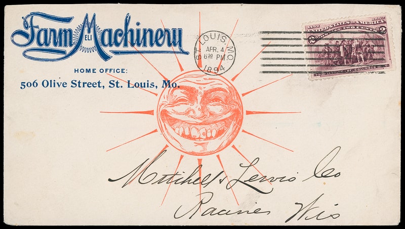 (Manufacturing) Eli Farm Machinery, St. Louis Mo., red and blue illustrated ad showing unusual "man in the sun" design, on cover bearing 2¢ Columbian (231) tied by "St. Louis, Mo. Apr 4, 1894" machine cancel to Racine, Wisc., Apr. 4th arrival backstamp.