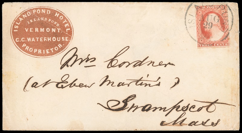 (Cameo) Island Pond Hotel, Vermont, brown oval corner card on cover bearing 3¢ dull red (11) , large margins to touched, tied by "Island Pnd Vt., Aug 29" cds to Swampscot Mass., Very Fine and scarce Vermont hotel cameo.