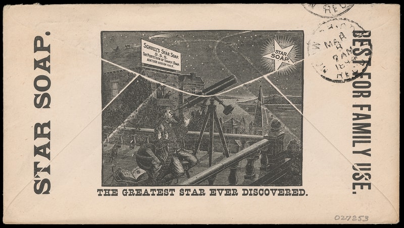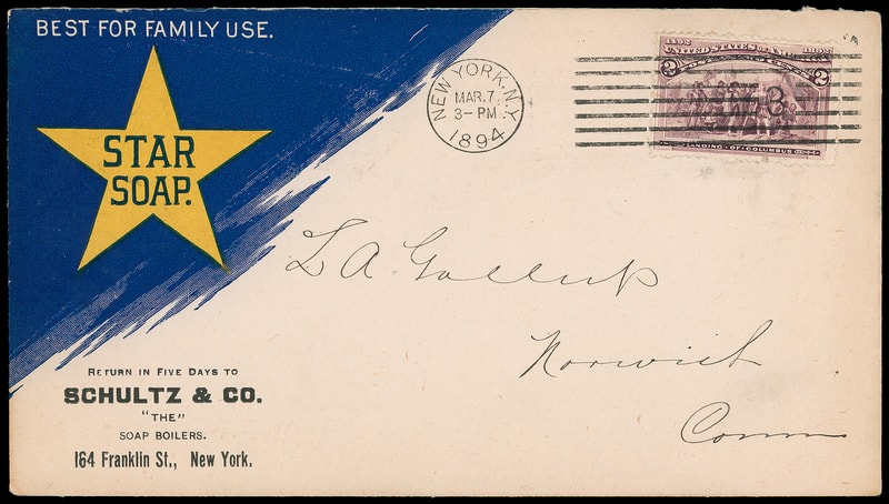 (Household Goods) Star Soap, Schultz & Co., New York N.Y., golden yellow and navy blue advertising design on cover bearing 2¢ Columbian (231) tied by "New York, N.Y. Mar 7, 1894" machine cancel to Norwich Conn., Mar. 8th receiving backstamp, reverse with wonderful scene showing man with telescope looking at "Star Soap" in the nighttime sky, Very Fine.