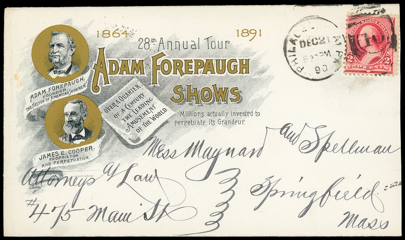 (Circus & Entertainment) Adam Forepaigh Shows, 28th Annual Tour, gold-leaf illustrated ad on cover bearing 2¢ carmine (220) tied by "Philadelphia Pa., Dec 21, 90" duplex to Springfield Mass., Dec. 22nd receiving backstamp, Very Fine and attractive.