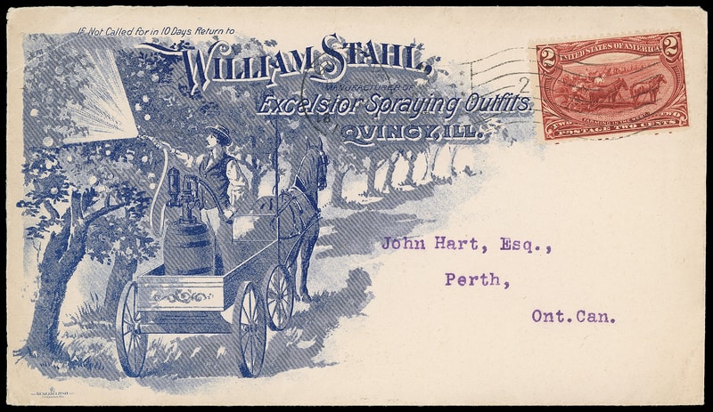 (Manufacturing) William Stahl, Excelsior Spraying Outfits, Quincy Ill., ornate illustrated advertising design on cover bearing 2¢ Trans-Miss (286) tied by "Quincy, Ill. Jun 22, 1898" flag machine cancel to Perth, Canada, design depicts a man spraying trees from a horse-drawn carriage; light cover corner crease upper right causing small 2¢ flaw, still a Very Fine and outstanding advertising design.