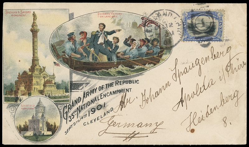 (Expos & Fairs) Grand Army of the Republic 35th National Encampment, Cleveland Ohio, multicolor illustrated design on cover bearing 5¢ Pan-American (297) tied by "Cleveland, Ohio, Oct 12, 1901" machine cancel to Heidenberg, Germany ; stamp with tiny tear at top right, still Very Fine and spectacular design.