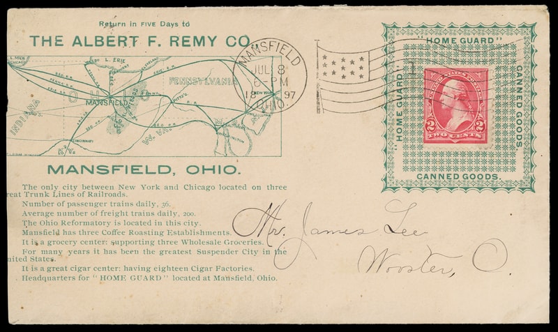 (Food) Alfred F. Remy Co, Mansfield Ohio, large ornate green collar and additional advertising at left showing map and summary of service available at Mansfield Ohio, on cover bearing 2¢ carmine (267) tied by "Mansfield, Ohio Jul 8 1897" flag machine cancel to Wooster Ohio, Very Fine.