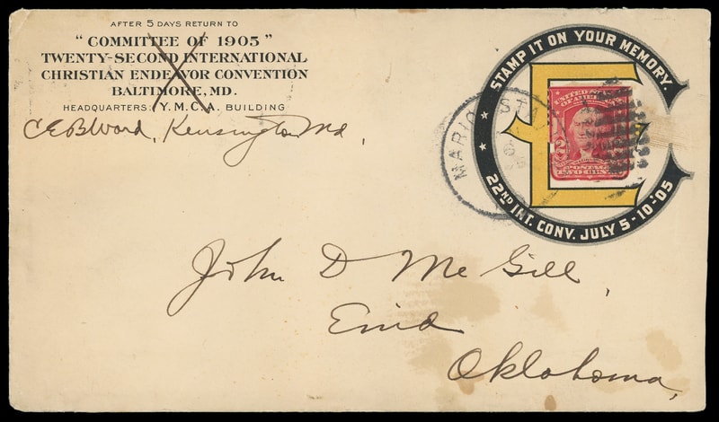 (Fraternal) "Committee of 1905" Christian Endeavor Convention, Baltimore Md., red and black advertising collar, printed corner card manuscript defaced showing private use, on cover bearing 2¢ carmine (319) tied by "Marion Station, Md. Jan 6, 1905" duplex to Enid, Oklahoma, light soiling and minor staining still, F.-V.F.