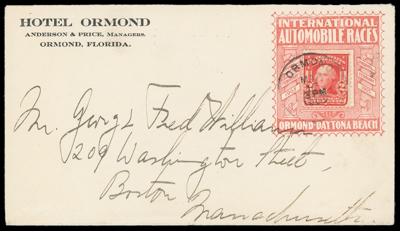 (Auto) International Autombile Races, Ormond-Daytona Beach, large red advertising collar on Ormond Hotel corner card cover bearing 2¢ carmine (319) tied by "Ormond, Fla. Mar 16, 1905" cds to Boston Mass., scarce and early racing advertising, Extremely Fine.