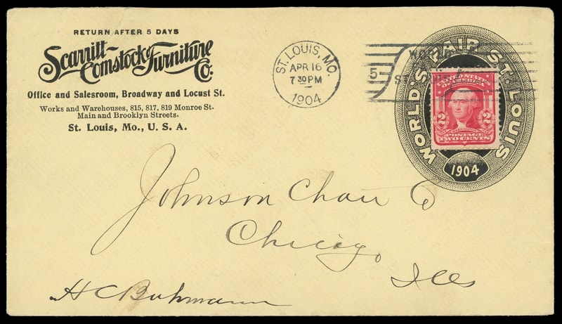 (Expos & Fairs) 1904 World's Fair St. Louis, oval collar for World's Fair on amber cover with "Scarritt Comstock Furniture" corner card bearing 2¢ carmine (319) tied by "St. Louis, Mo. Apr 16, 1904" World's Fair Station machine cancel to Chicago Ill.; scarce and attractive, Extremely Fine.
