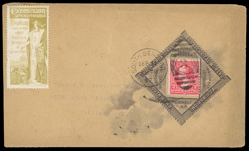 (Expos & Fairs) The International Patent and Technical Bureau, South Bend Indiana, diamond advertising collar for 1897 exhibition, additional yellow-green label for "Exposition International" in Brussels on buff cover bearing 2¢ carmine (267) tied by "South Bend, Ind. Sep 11, 1897" duplex to Williamsport Pa., small edge tear and light wrinkle, somewhat light typed address still, Very Fine and unusual.