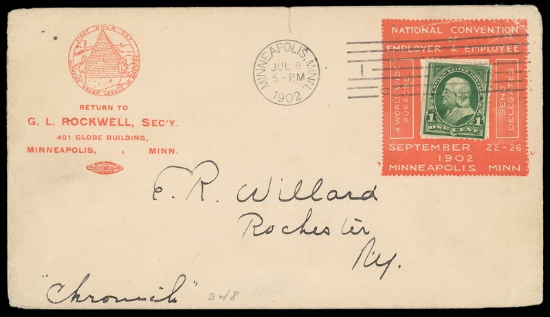 (Conventions) National Convention of Employer & Employee, Indianapolis Ind., large red 1902 advertising collar on cover bearing 1¢ green (279) tied by "Indianapolis, Ind. Jul 8 1902" machine cancel to Rochester N.Y., edge tear at top, Very Fine, ex-Atwood .