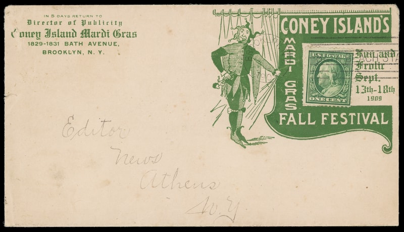 (Expos & Fairs) Coney Island's Mardi Gras Fall Festival, ornate green illustrated collar on Director of Publicity for Madri Gras festival corner card cover bearing 1¢ green (331) tied by "Brooklyn N.Y. 1909" machine cancel to Athens N.Y., minor edge tear at left still, Very Fine, ex-Gabriel .
