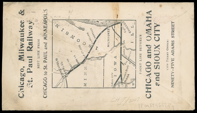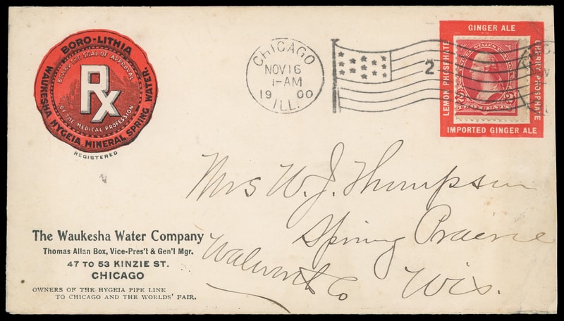 (Medical) The Waukesha Water Co., Chicago Ill, red advertising collar for various water cures and soft drinks on cover bearing 2¢ carmine (279B) tied by "Chicago Ill. Nov 16 1900" flag machine cancel to Spring Prairie, Wisconsin, additional map on reverse for connections from Chicago to various Railroad lines, barely reduced, Very Fine.