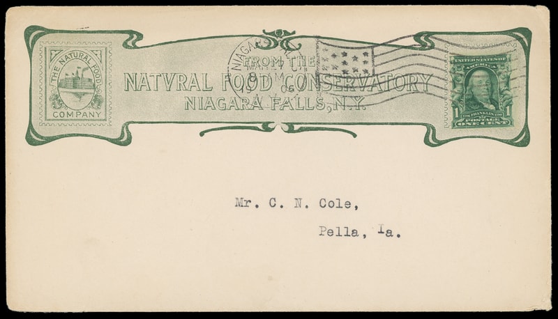 (Foods) Natural Food Conservatory, Niagara Falls, N.Y., ornate green frame across top on cover bearing 1¢ green (300) tied by "Niagra Falls, N.Y. Mar 27, 1906" machine flag cancel to Pella, Iowa, unusual collar design, Extremely Fine.