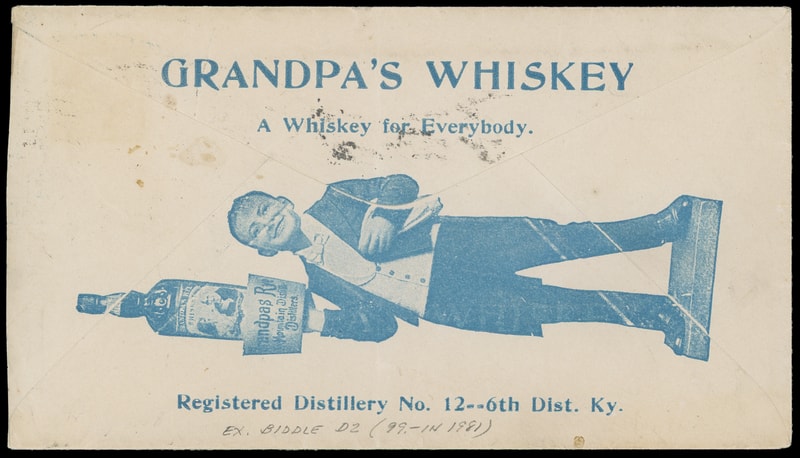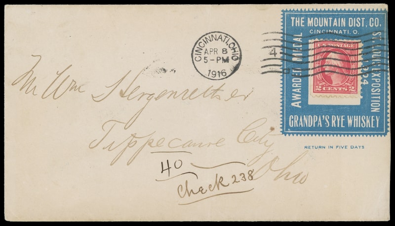 (Alcohol) Grandpa's Rye Whiskey, The Mountain Distribution Co, Cincinnati Ohio, large blue advertising collar on cover bearing 2c rose red (425) tied by "Cincinnati, O. Apr 8, 1916" machine cancel to Tippecanoe City, Ohio, additional overall blue illustrated advertising on reverse, very slightly reduced at right, Very Fine, ex-Biddle .