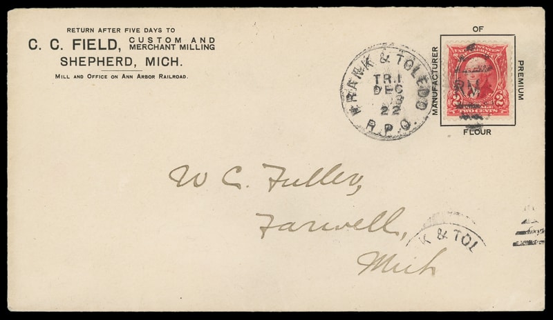 (Food) C.C. Field, Custom and Merchant Milling, Shepard, Michigan, black collar on cover bearing 2¢ carmine (301) tied by "Frank & Toledo R.P.O. TR1, Dec 13, 1903" railroad duplex to Farwell, Michigan, Very Fine.
