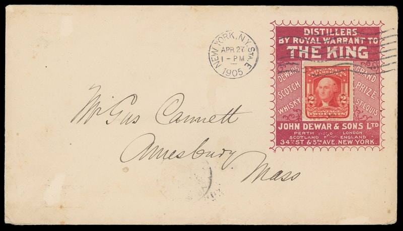 (Alcohol) "Distillers by Royal Warrant to The King", John Dewar & Sons, New York N.Y., large maroon collar on cover bearing 2¢ carmine (319) tied by "New York N.Y. April 24, 1905" machine cancel to Amesbury, Mass., backflap with light stain, Very Fine.