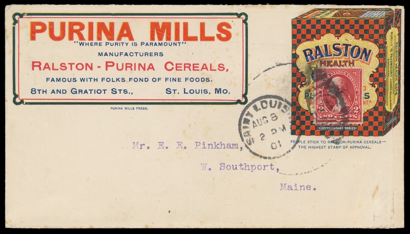 (Food) Purina Mills "Ralston Health" St. Louis, Mo., multicolored illustrated advertising on cover bearing 2¢ carmine (279B) tied by "St. Louis, Mo. Aug 8, 1901" duplex to W. Southport, Maine, stamp with trivial flaw, cover with some minor wrinkling, Very Fine and attractive.