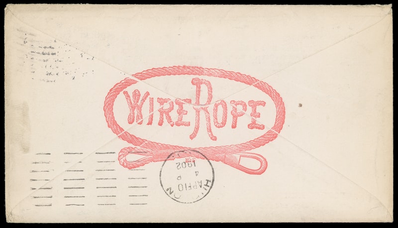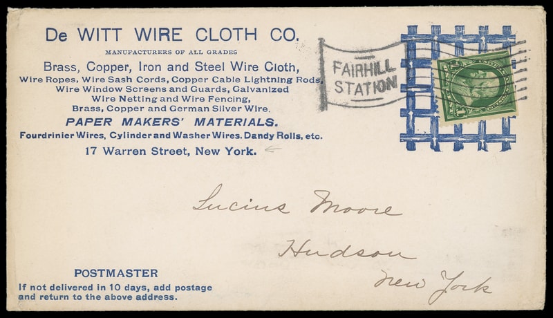 (Manufacturing) DeWitt Wire Cloth Co., New York, NY, blue illustrated collar type showing grated fence, additional red advertising on reverse on cover bearing 1¢ green (279) tied by "Fairhill Station" flag cancel to Hudson, N.Y., "Apr. 10, 1902" arrival backstamp, Very Fine.