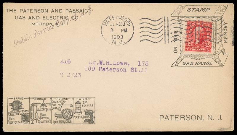 (Stoves) The Paterson and Passaic Gas and Electric Co, Paterson, NJ, black illustrated collar on cover bearing 2¢ carmine (301) tied by "Paterson N.J. Jun 29, 1903" machine cancel to Paterson N.J., Very Fine.