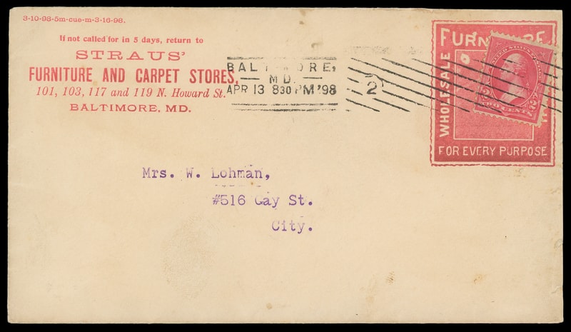 (Furniture) Straus' Furniture and Carpet Stores, Baltimore, Md., large red collar on cover bearing 2c carmine (267) tied by "Baltimore Apr 13 '98" machine cancel to local city street address, tiny nicks and barely reduced still, Very Fine.