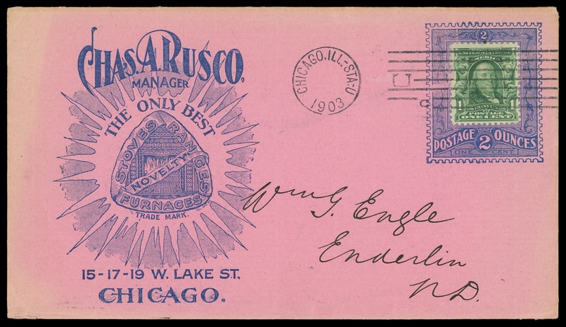 (Stoves) Chas. A. Rusco, Manager, Chicago, Ill, ornate large blue collar "Postage 2 Ounces" and overall blue illustrated advertising on reverse of pink cover bearing 1¢ green (300) tied by "Chicago, Ill. Sta. U, 1903" machine cancel to Enderlin, N.D., some light edge "bleaching" of color at left and top edges, still, Very Fine and scarce design.