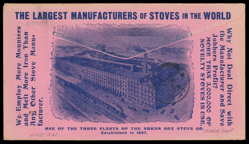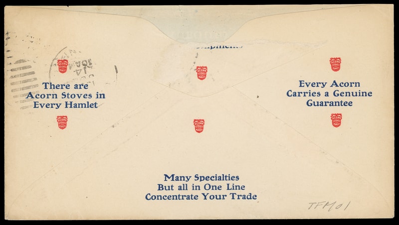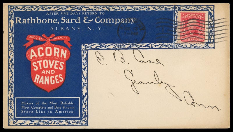 (Stoves) Acorn Stoves and Ranges, Rathbone, Sard & Co., Albany, N.Y., near overall red and blue design incorporating collar at right, on cover bearing 2¢ carmine (319) tied by "Albany, N.Y.Jul 13, 1908" machine cancel to Granby, Conn., with additional advertising on reverse, missing backflap, Very Fine.