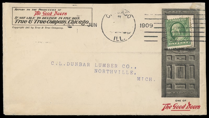 (Doors) "The Good Doors" True & True Company, Chicago Illinois, ornate large illustrated collar on cover bearing 1¢ green (331) tied by "Chicago, Ill. 1909" machine cancel to Northville, Mich., F.-V.F.