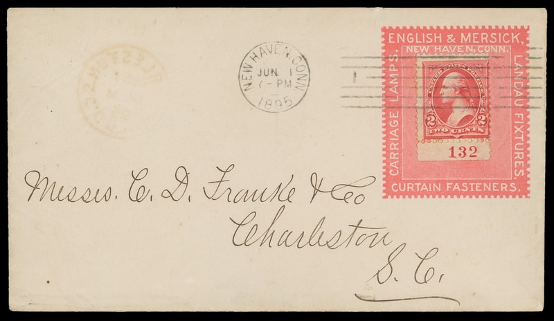 (Hardware) "Carriage Lamps, Landau Fixtures", English & Mersick, New Haven Conn., ornate pink collar on cover bearing 2¢ carmine (220) bottom P.#132 selvage, tied by "New Haven, Conn. Jun 1 1895" machine cancel to Charleston, S.C., Very Fine.