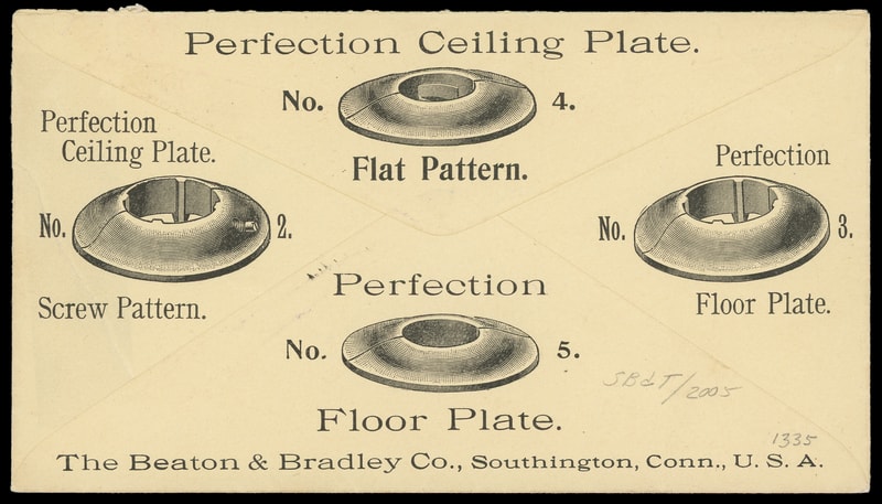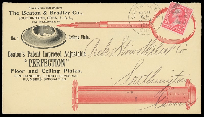(Construction) "Perfection Floor and Ceiling Plates", Beaton & Bradley Co. Southington, Ct., multicolored illustrated advertising including collar at right on amber cover bearing 2¢ carmine (267) tied by "Southington, Conn. Mar 21 1898" duplex to Southington, Conn., stamp with corner flaw, Very Fine.