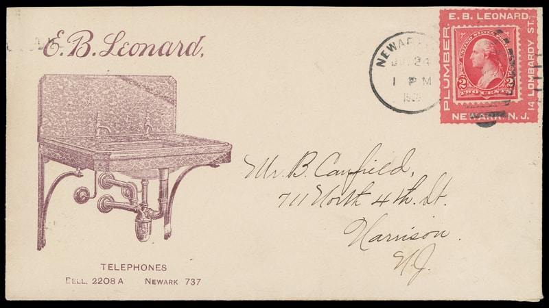 (Plumbing) E.B. Leonard, Newark N.J., red advertising collar showing purple illustration (sink) at left, on cover bearing 2¢ red (279B), natural s.e tied by "Newark, N.J. Jul 24, 1900" duplex to Harrison N.J.; flap missing, Very Fine.