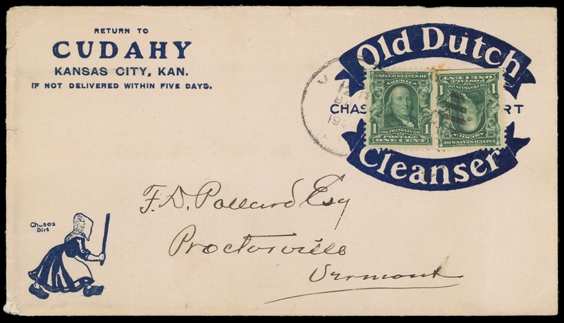 (Household Goods) "Old Dutch Cleanser", Cudahy, Kansas City Kans., blue illustrated front and back advertising on cover bearing two 1¢ green (300) singles tied by indistinct duplex to Proctorville Vt., some light edge wear and small backflap tear, F.-V.F.