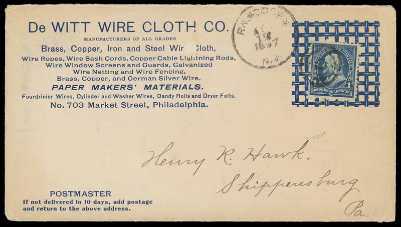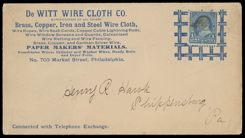 (Manufacturing) DeWitt Wire Cloth Co., Philadelphia Pa., blue collar type illustrated advertising showing grated fence on cover bearing 1¢ blue (264) canceled by cork to Shippensburg, Pa., Very Fine.
