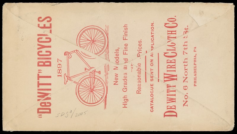 (Manufacturing) DeWitt Wire Cloth Co., Philadelphia Pa., blue collar type showing grated fence with additional red illustrated "DeWitt" Bicycles advertising on reverse of cover bearing 1¢ blue (264) tied by target duplexed with "Rancocos, N.J. Aug 12, 1897" cds to Shippensburgh Pa., Very Fine.
