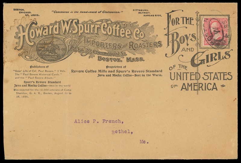 (Household Goods) Howard W. Spur Coffee Co., Boston, Mass., "For The Boys and Girls of the United States", illustrated advertising on 7-3/4" x 5" manila envelope, 2¢ (267) tied by "Boston, Mass." double oval, type addressed to Bethel, Me., light waterstain and lacking sealed flap on left, trivial light vertical file fold, F.-V.F.