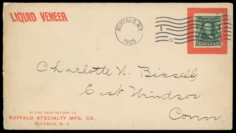 (Manufacturing) "Liquid Veneer" Buffalo Specialty, Mfg. Co., solid red collar with 1¢ green (300) tied by "Buffalo, N.Y. 1905" machine cancel to East Windsor, Ct., small stamp flaws, and light cover edge flaws at left still, F.-V.F.