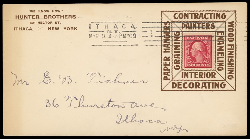 (General Contractors) Hunter Brothers, Ithaca, N.Y., large brown advertising collar on cover bearing 2¢ carmine (332) tied by "Ithaca, N.Y. Mar 9 4:30PM '09" machine cancel to Ithaca, NY, extremely light edge toning still, F.-V.F.