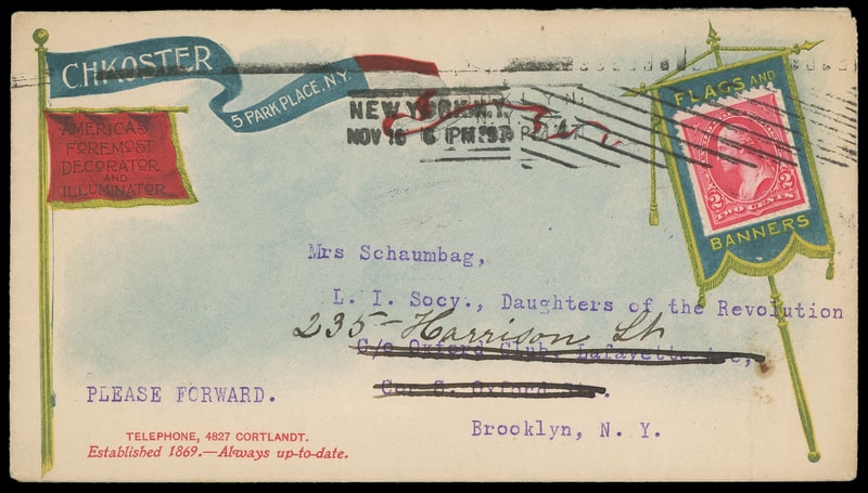 (Furnishings) C.H. Koster, New York, multicolored advertising collar banner, additional near overall multicolored advertising on cover bearing 2¢ carmine (267) tied by "New York, N.Y. Nov 16 '97" machine cancel to Brooklyn N.Y., backflap with small piece out, Very Fine and quite attractive.