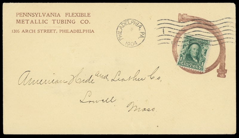 (Manufacturing) Pennsylvania Flegible Tubing Co., Philadelphia, interesting brown illustrated collar of circular metal tubing on cover bearing 1¢ green (300) nat. s.e. tied by "Philadelphia Pa. 1904" machine cancel to Lowell Mass., unusual, Very Fine.