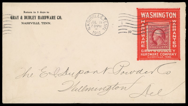 (Hardware) Washington Hardware Warranted, Gray & Dudley, Nashville, TN, red advertising collar on cover bearing 2c carmine (375) tied by "Nashville, Tenn. Jul 11 1911" machine cancel to Willmington Del, Very Fine.