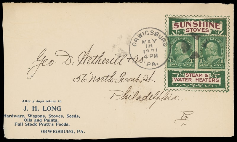 (Stoves) "Sunshine Stoves, Steam & Water Heaters", JH Long Orwigsburg Pa., brown and blue large collar on cover front only, bearing 1¢ green pair (279) tied by "Orwigsburg Pa. May 17 1901" duplex to Philadelphia, extremely attractive collar, still, F.-V.F. appearing.