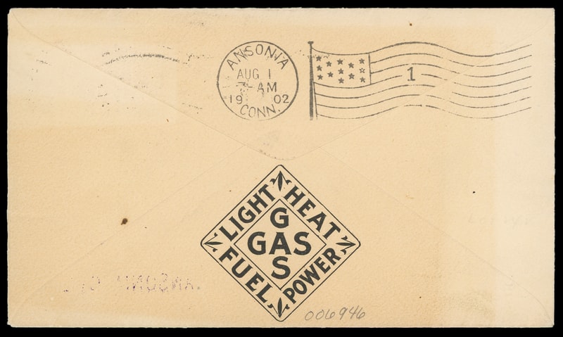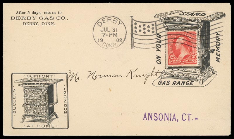(Stoves) Derby Gas Co., Derby, Conn., illustrated advertising collar with additional advertising at lower left, both showing early gas stove, additional advertising on reverse on cover bearing 2¢ red (279B) tied by "Derby Conn. Jul 31 1902" flag cancel to Ansonia, Ct, Very Fine.